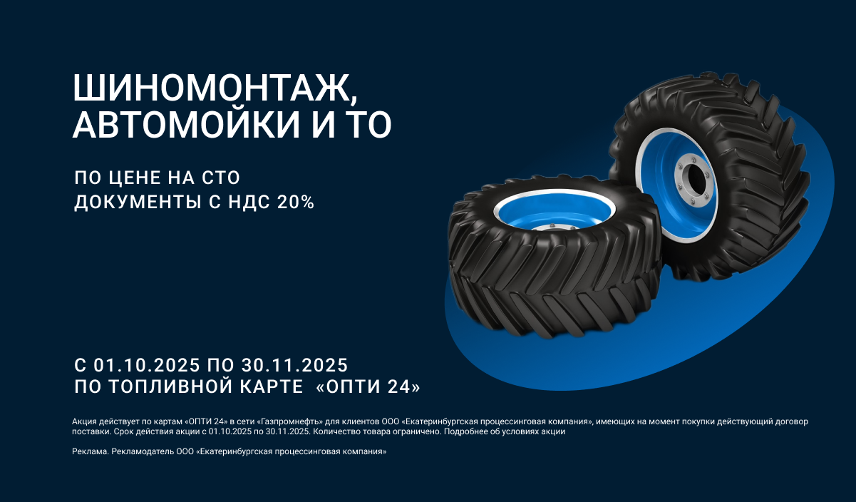 ООО «Екатеринбургская процессинговая компания» запускает акцию «Шиномонтаж, автомойки и техобслуживание по цене на СТО с 01.10.2025 г. по 30.11.2025 г.» по топливным картам «ОПТИ 24».